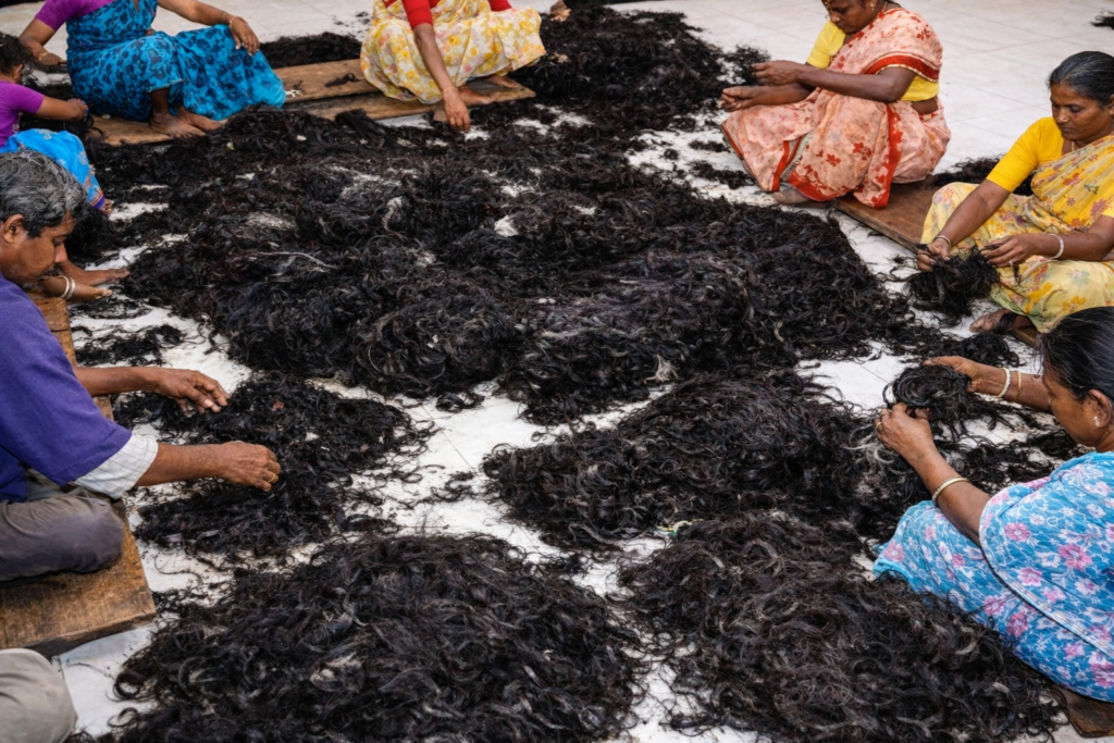 After being sold through temple auctions in India, the hair enters a large international supply chain. Buyers transport the raw hair to processing units where it goes through several stages such as deep cleaning, sorting by length and texture, and removing short or damaged strands.
